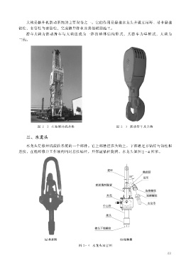 大钩是修井机游动系统的主要设备之一。 它的作用是悬挂水龙头并通过吊环、 吊卡悬挂 钻柱、 套管柱与油管柱, 完成修井作业及其他辅助施工。 游车大钩为游动滑车与大钩组成为一体的整体结构形式, 其游车为单轴式, 大钩为 三钩。 图 2 2 石油修井机井架 图 2 3 游动滑车及大钩 三、 水龙头 水龙头是修井机旋转系统的一个部件。 它上部悬挂在大钩上, 下部通过方钻杆与钻柱相 连接, 在循环修井工作液的同时悬挂钻柱, 并保证钻柱旋转。 水龙头如图 2 4 所示。 图 2 4 水龙头示意图 33